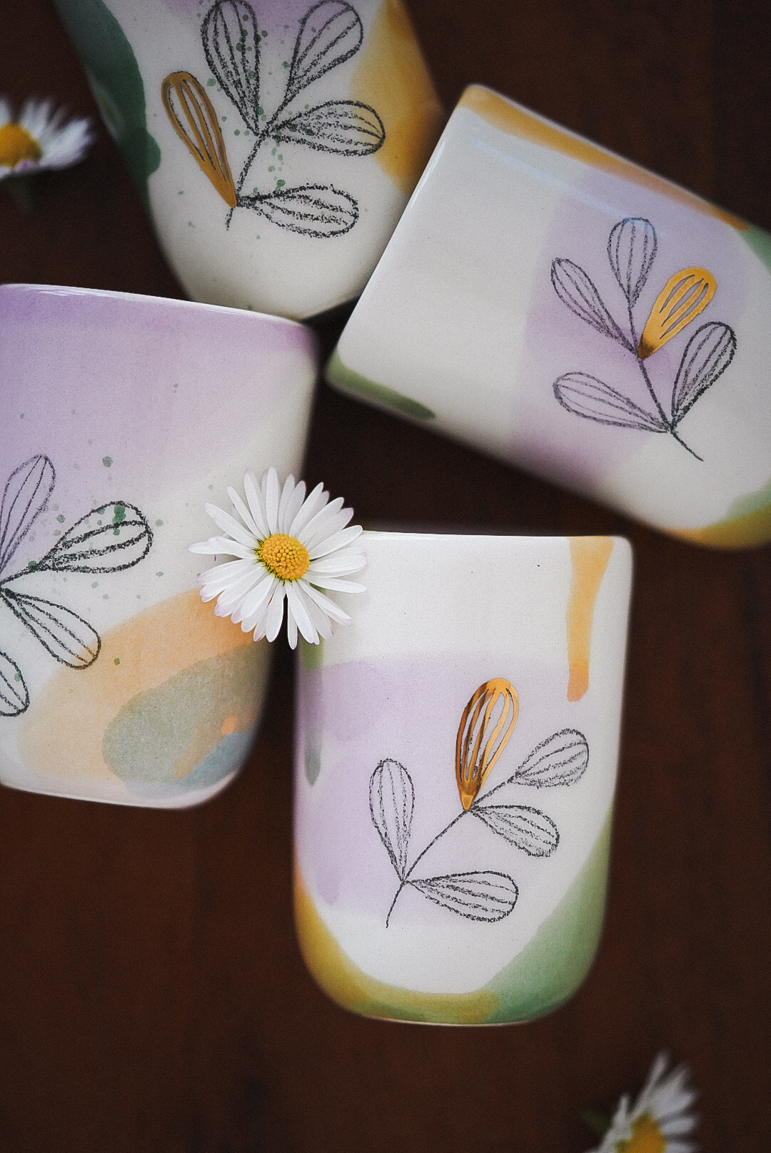 The pastel colours, the floral motifs, the hazy feel… There is something about the airiness of an underglaze pen in fusion with breezy watercolored landscapes and a 24 ct golden sparkle that just makes me feel good. With this cup in hand, I am ready to plan my next nature adventure. Come along!